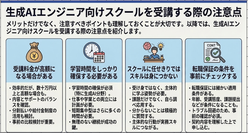 以降では、生成AIエンジニア向けスクールを受講する際の注意点を紹介します。