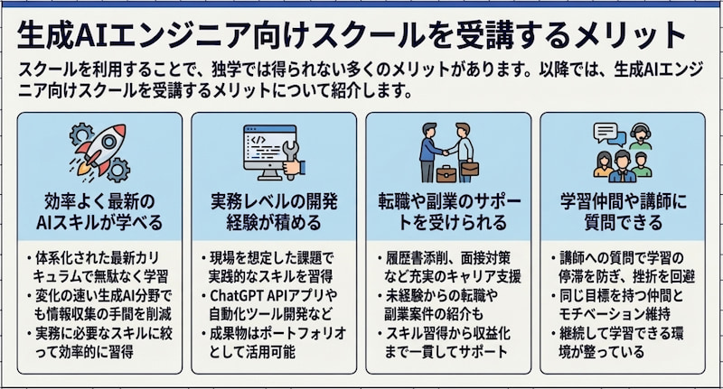 以降では、生成AIエンジニア向けスクールを受講するメリットについて紹介します。