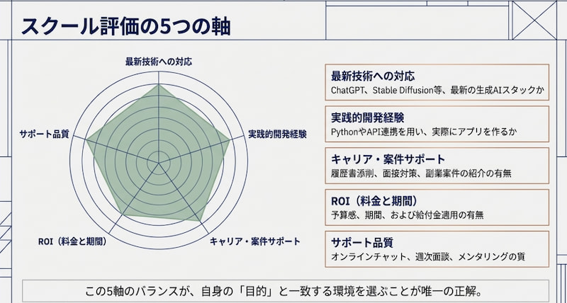 生成AIエンジニアを目指すうえで、スクール選びは非常に重要なポイントです。どのスクールを選ぶかによって、学習効率やその後のキャリアに大きな差が生まれます。