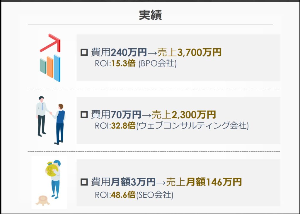 限定イベントの参加、コミュニティマネージャによるトスアップ、井上のマーケや営業の支援が受けられます。2026年1月現在では売上5000万円越え、ROI50倍突破などあり得ない実績も叩き出しています。